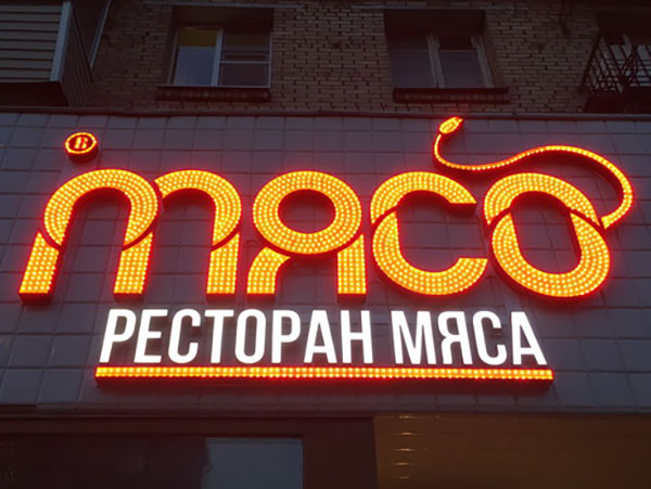 Заказчик — мясной ресторан — обратились к нам для производства светодиодных led букв с открытыми пикселями, которые должны были быть яркими, привлекающими внимание в светлое и темное время суток. Основные требования при исполнении данного заказа: