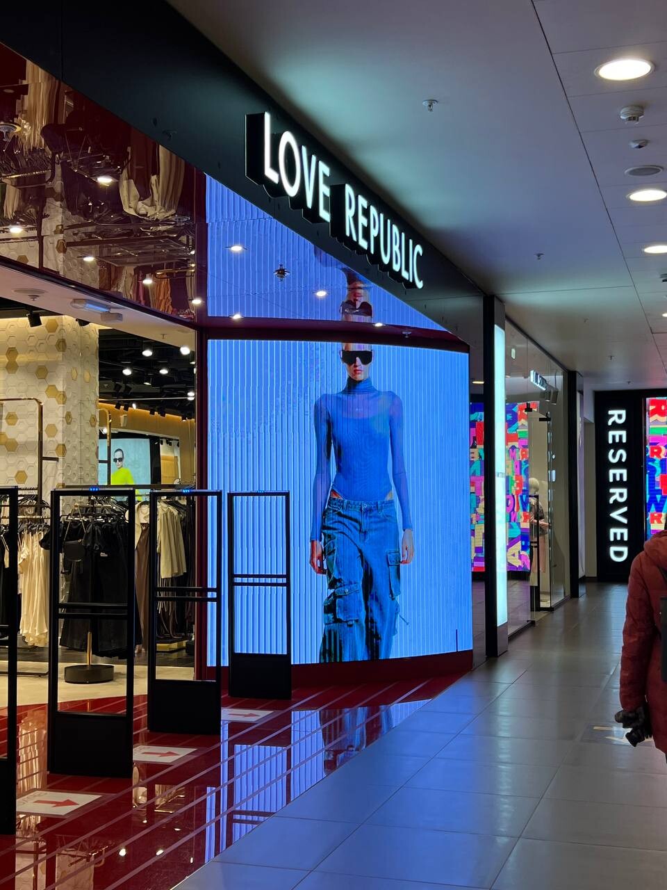 На встрече с клиентом уточнили размеры места установки, бюджет и требования к типу светодиодного LED экрана для рекламы. Светодиодный LED экран в магазине одежды Love Republic оформлен в современном стиле, который подчеркивает премиальность бренда. Экран занимает центральное место, что делает его заметным для прохожих. На экране отображается яркая реклама с моделями в одежде из коллекции магазина. Дизайн экрана дополнен подсветкой, которая создает эффектный визуальный акцент в вечернее время.