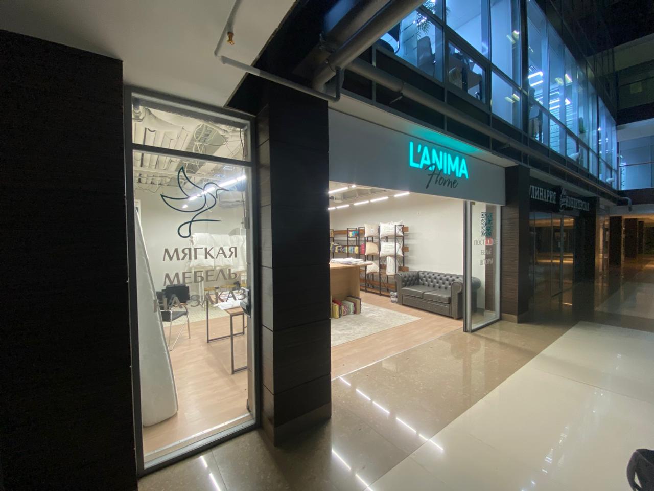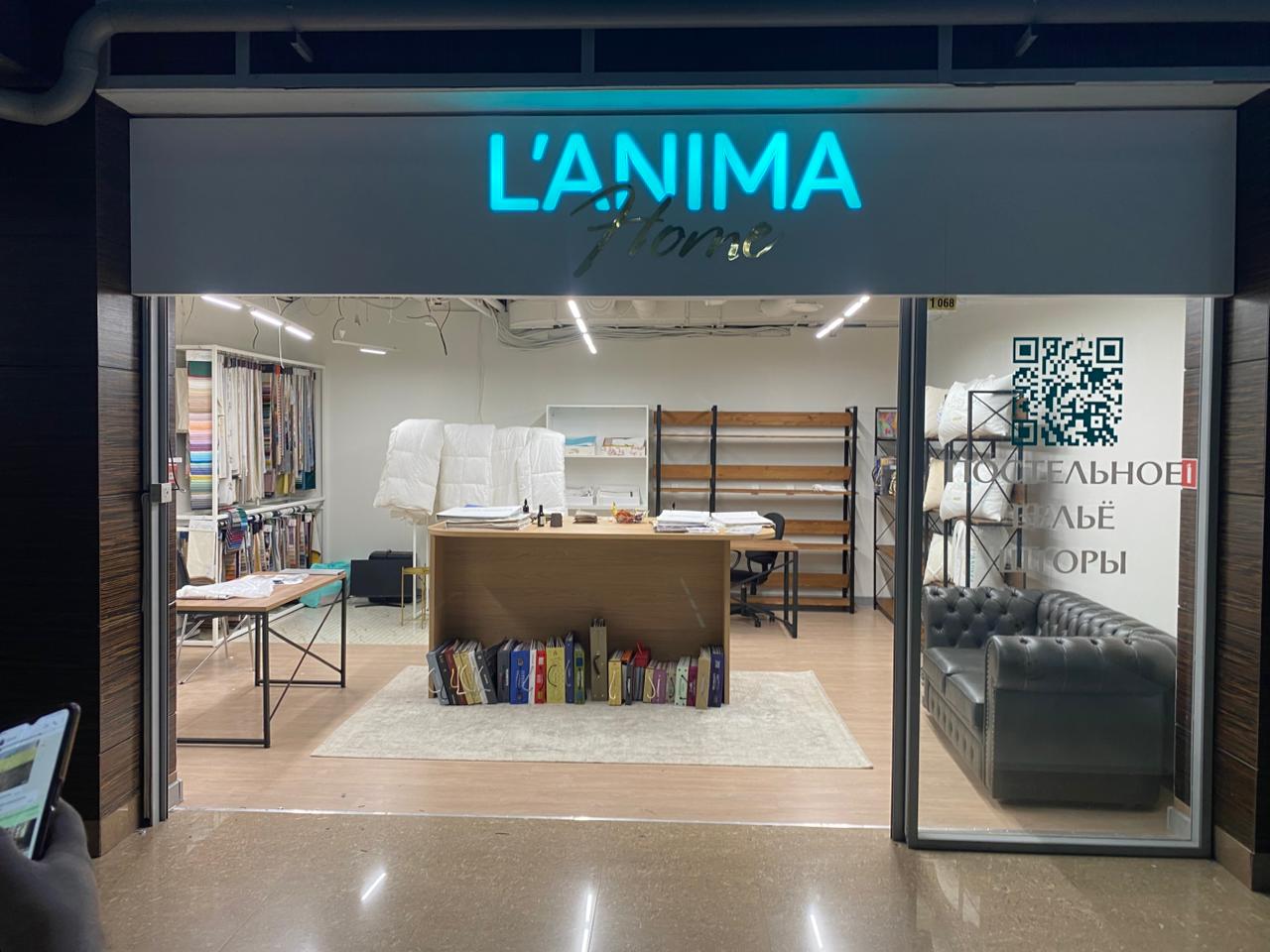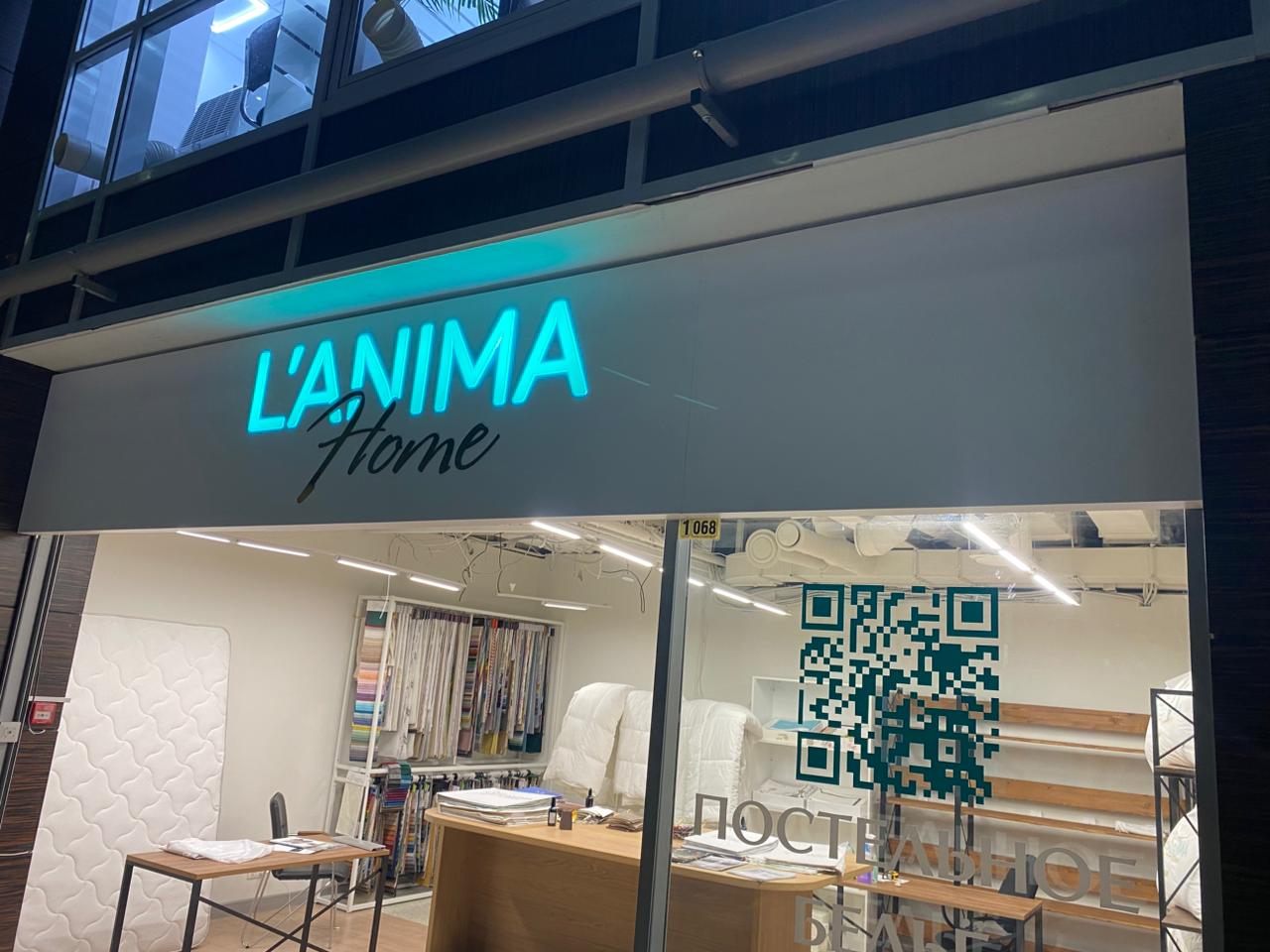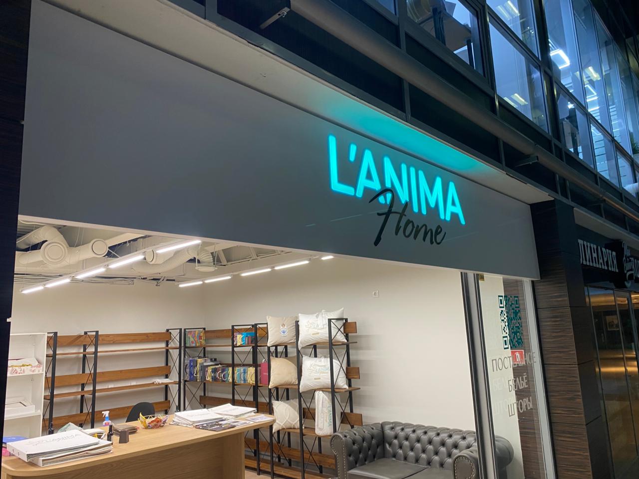 На встрече с клиентом уточнили размеры места установки, бюджет и требования к типу и дизайну светового короба с инкрустацией. Световой короб с инкрустацией для вывески «L’ANIMA Home» представляет собой современную и стильную конструкцию, которая привлекает внимание благодаря яркому неоновому свечению и элегантному дизайну. Название бренда выполнено в двух стилях: слово «L’ANIMA» выделено ярким голубым неоном, а «Home» написано изящным шрифтом, что создает контраст и подчеркивает индивидуальность бренда.
