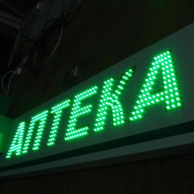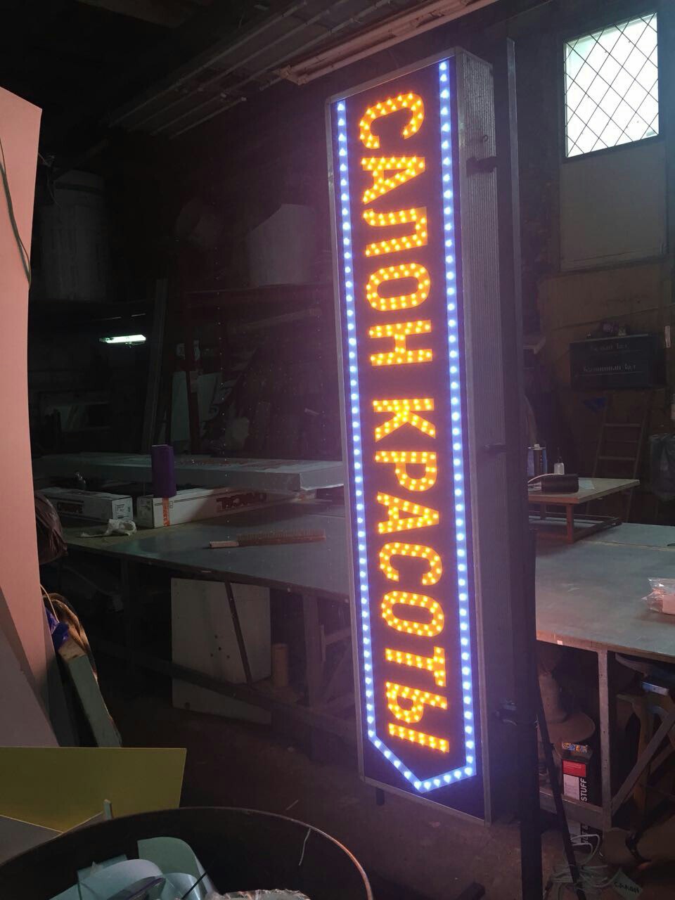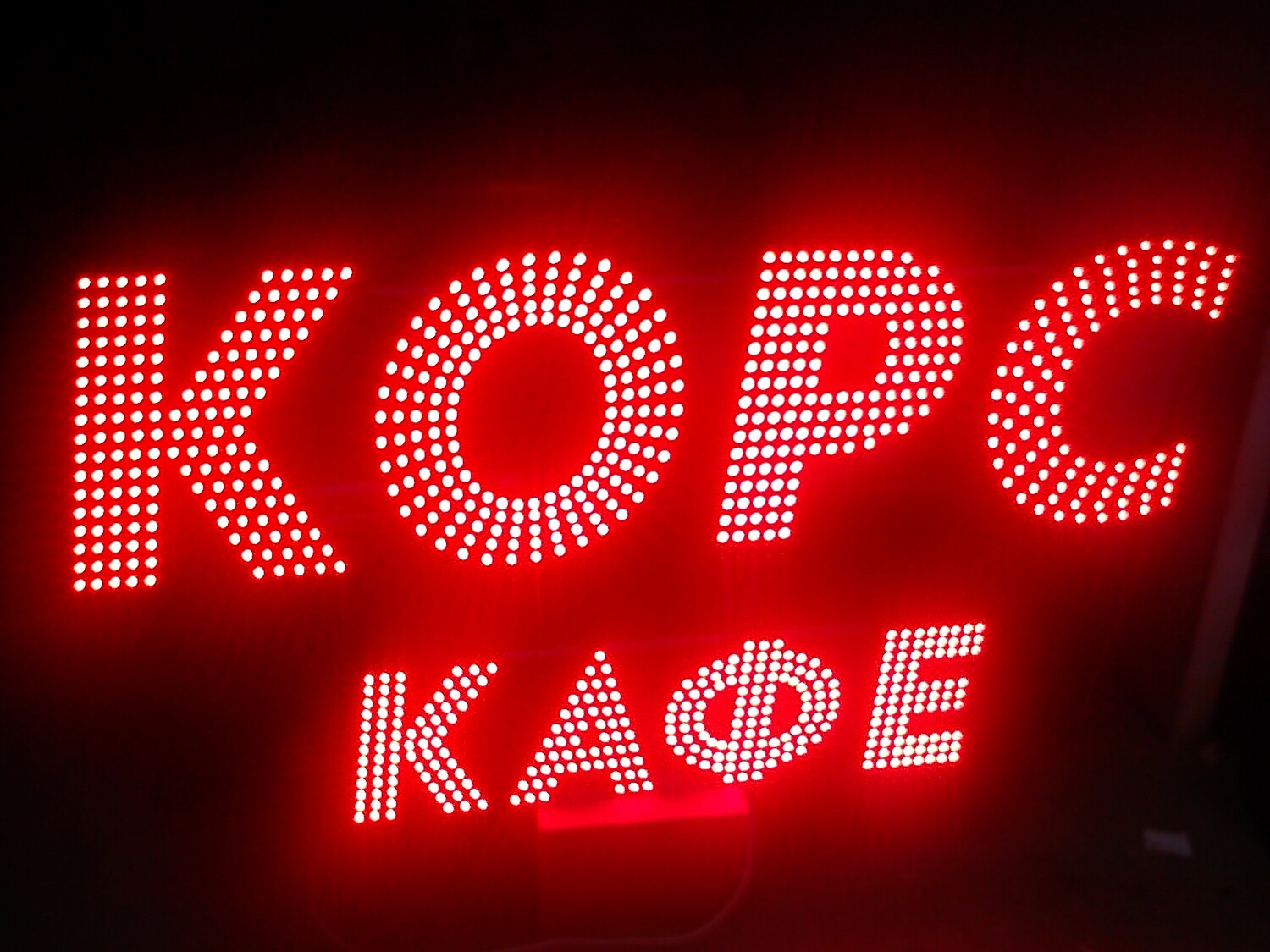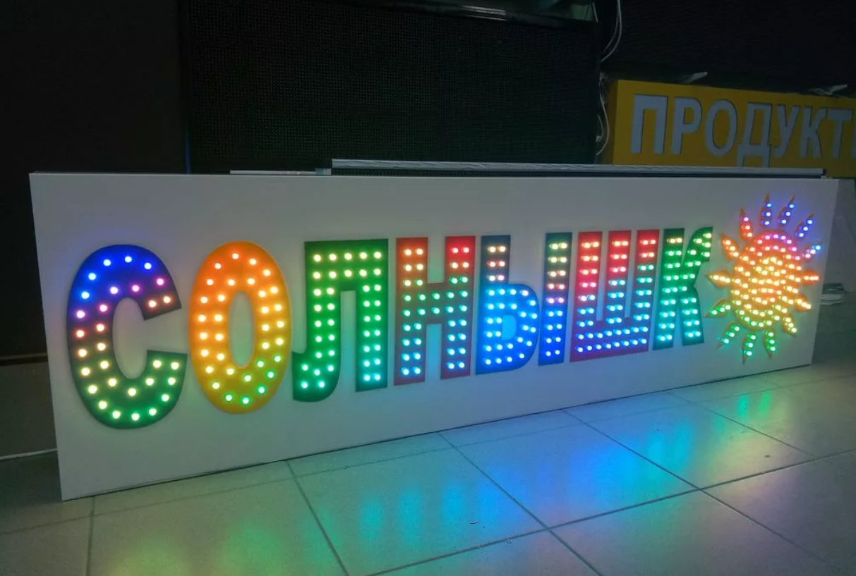 Светодиодный короб — это пиксельная рекламная вывеска прямоугольной, круглой, овальной или сложной формы. Светодиоды для подсветки такой конструкции устанавливают не внутри короба, а выводят наружу, вставляя в прорези во фронтальной части. Открытые пиксели создают более яркое свечение и выглядят оригинально.