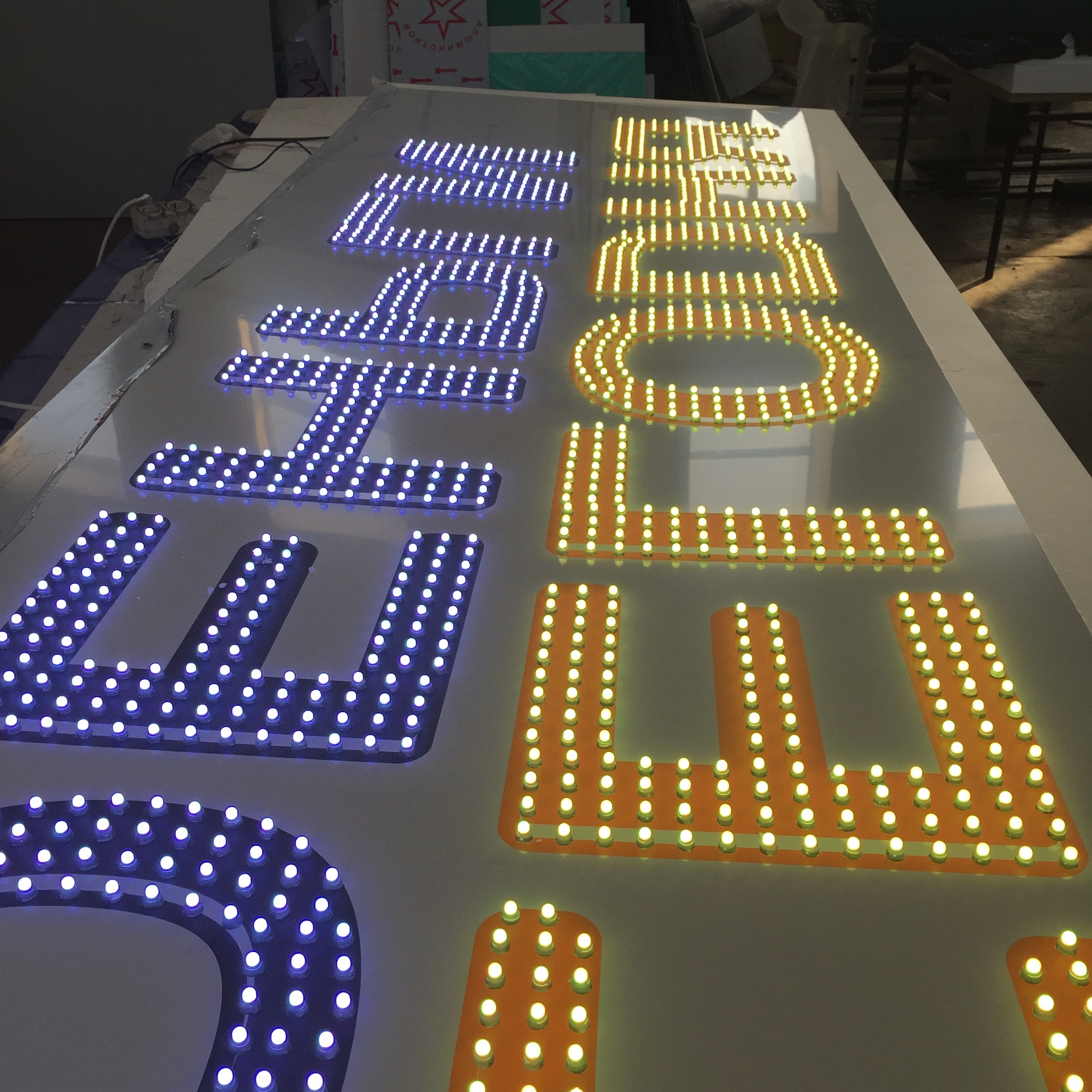 Светодиодные короба — эффективный инструмент рекламы благодаря повышенной яркости и необычному виду. По желанию заказчика можно установить RGB (полноцветную) подсветку и сделать ее динамичной с помощью контроллера. Кроме того, есть возможность создавать более экономичные варианты вывесок, регулируя плотность пикселей на корпусе.