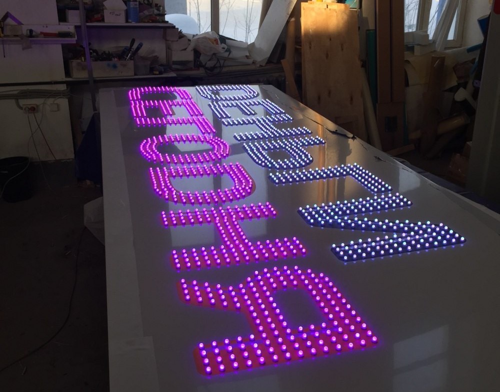 Светодиодный короб изготавливают из алюминиевого композита (2200 до 2600 руб/м²), акрила (3000-5000 руб/м²), ПВХ пластика (300 до 2000 руб/м²). Для подсветки используют светодиодные пиксели в защитном корпусе от 18 рублей за штуку. К этому надо прибавить стоимость блока питания, диммеров и контроллеров. Резка и формовка обойдется в 3000 рублей, а сборка и монтаж подсветки — в 4000 рублей.